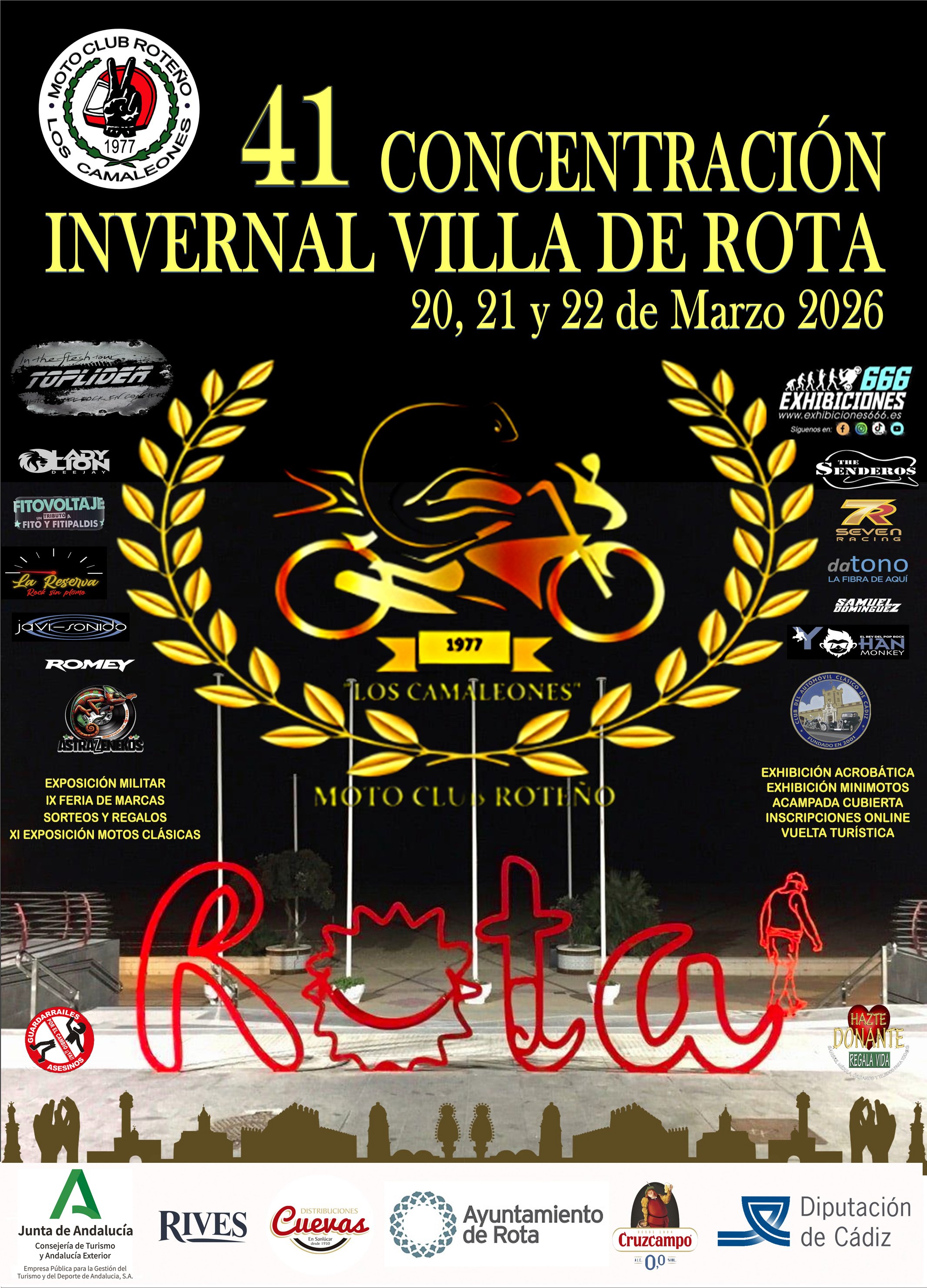 Por tanto, el agradecimiento ha sido esta vez para todos los moteros que se han mostrado fieles pese al cambio de fecha, que se espera que para 2027 vuelva a ser el primer fin de semana de febrero, para los socios y colaboradores que han estado al pie del cañón en la organización, para la Policía Local, Policía Nacional, Guardia Civil y Protección Civil por estar pendiente en los dispositivos de seguridad y tráfico. De igual forma, se ha dado las gracias a las administraciones que han colaborado, como el Ayuntamiento de Rota, que es la administración que más se implica al entender el evento como clave para la localidad, la Junta de Andalucía y la Diputación Cádiz que aportan su patrocinio destacando que es una motorada que se ha convertido en atractivo turístico y que piensan seguir apoyando, y a la Armada española e Infantería de Marina que han participado este domingo con la exhibición de vehículos y diverso material.