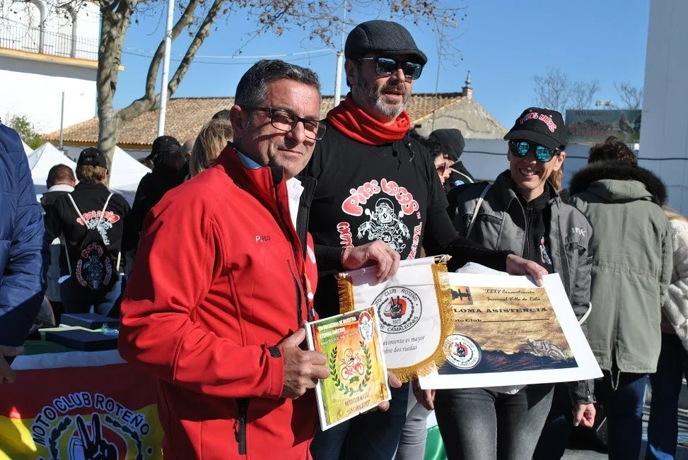 Los premios han seguido para el motoclub con más inscritos que ha sido en primer lugar "Pitos locos" de Bellavista con 49 socios en la concentración motera de Rota, y "Komando a mi moto" con 38 socios se han quedado en segundo lugar. Por último, la mujer piloto venida desde más lejos ha sido Eva Barrero López desde Badajoz, mientras que también se han entregado premios a los autores de las mejores fotos en Instagram y Facebook, Laura Bellido y Jesús Martín respectivamente. El autor del cartel anunciador de esta XXXV Concentración Invernal "Villa de Rota", David Gallardo, ha sido otro de los premiados a los que el Motoclub Roteño "Los Camaleones" le ha entregado un detalle.