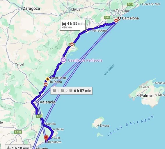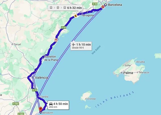 Día 23 de Junio, San Juan, salimos hacia Benidorm sobre las 10:20 después de desayunar en la residencia nos invitan a comer la" Coca" , en el trayecto vemos un coche volcado en la cuneta, el único accidente que hemos visto en todo el viaje. Paramos a comer por el camino y descansamos un poco hace calor, llegamos sobre las 17: 00, descargamos todo el equipaje, y nos tomamos el resto del día para descansar, realmente no hacemos nada mas que dormir, por saber no sabemos ni el día de la semana que es.