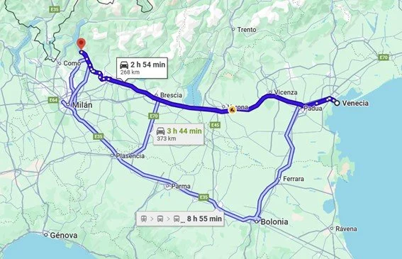 Son las 9:30 de la mañana, del día 16 de Junio, después de desayunar dejamos el camping y salimos dirección La De Como, vamos juntos hasta la entrada de la autopista, ya que nosotros no vamos a subir el Stelvio, amenazan lluvia en la subida y Jose decide no ir , Fermín y Tere toman dirección Monte Stelvio y nosotros hacia el Lago De Como