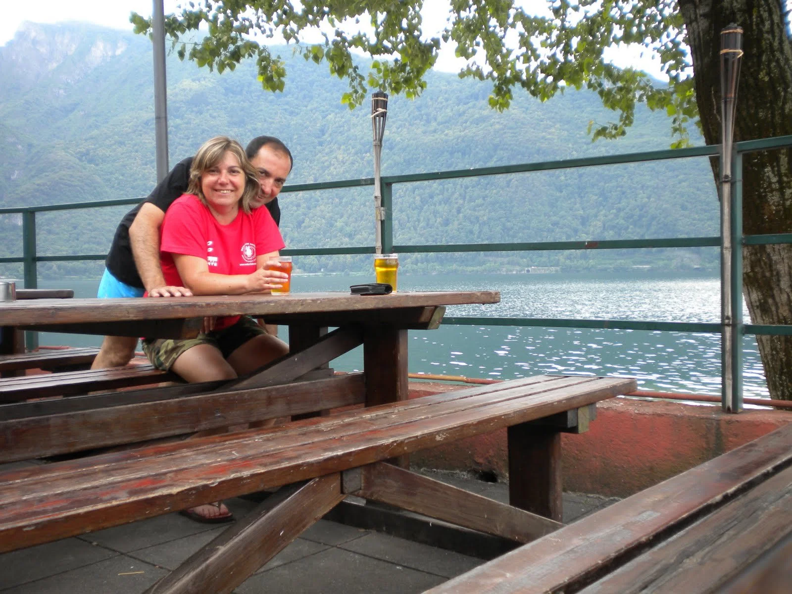 Desayunamos en el bar del camping y comienza a llover, toda la mañana perdida por culpa de la lluvia, salimos a comer a un bufet cercano y en el medio del camino nos cae una tromba de agua que no veas, Tere y yo salimos corriendo y nos ponemos pingando, Jose y Fermín se resguardan un poco y se mojan menos, al final comimos bien por 8 euros cada uno y con unas vistas sobre el lago, de maravilla, volvemos al camping y para de llover un poco y decidimos ir a visitar algún pueblo cercano