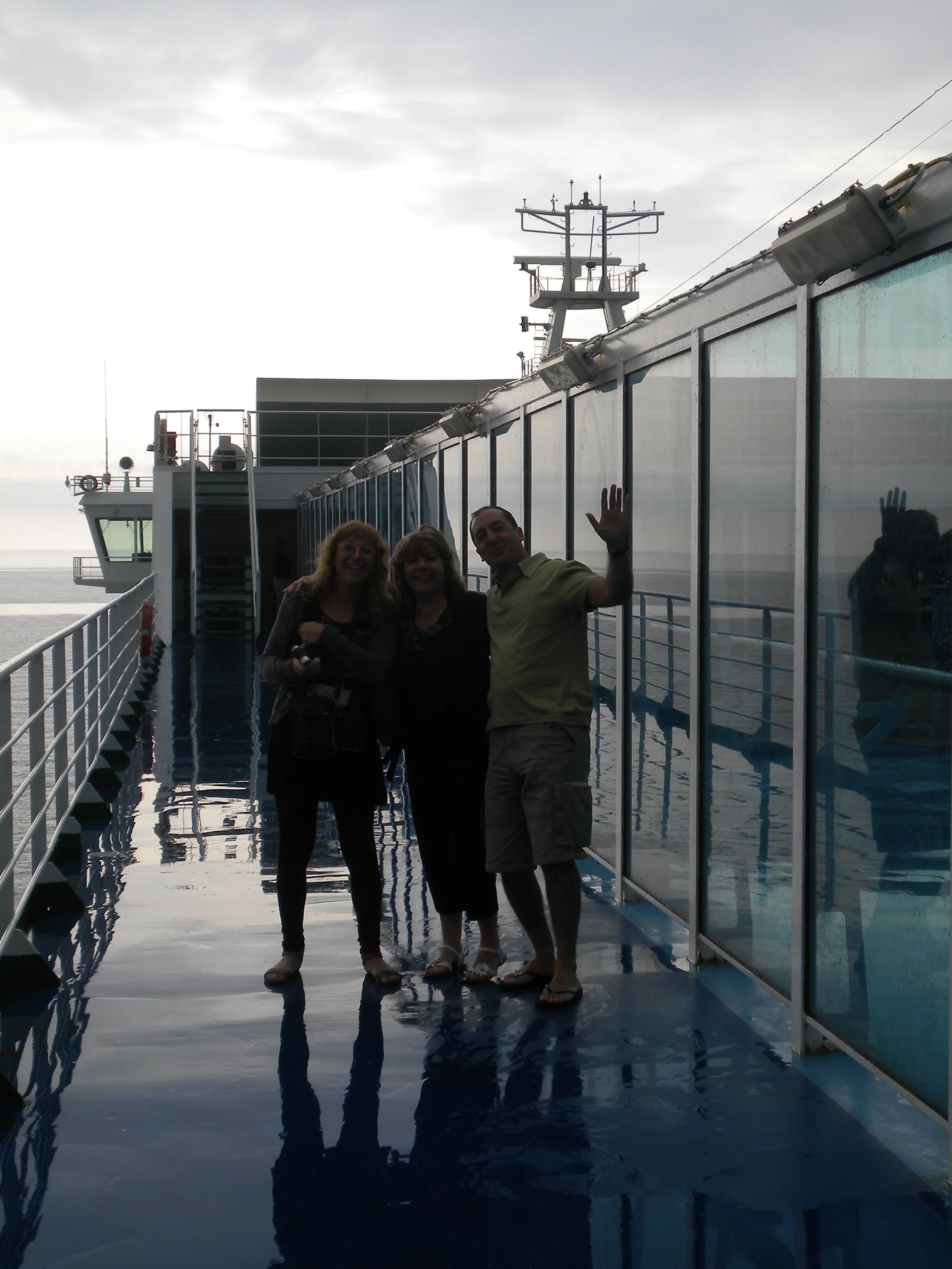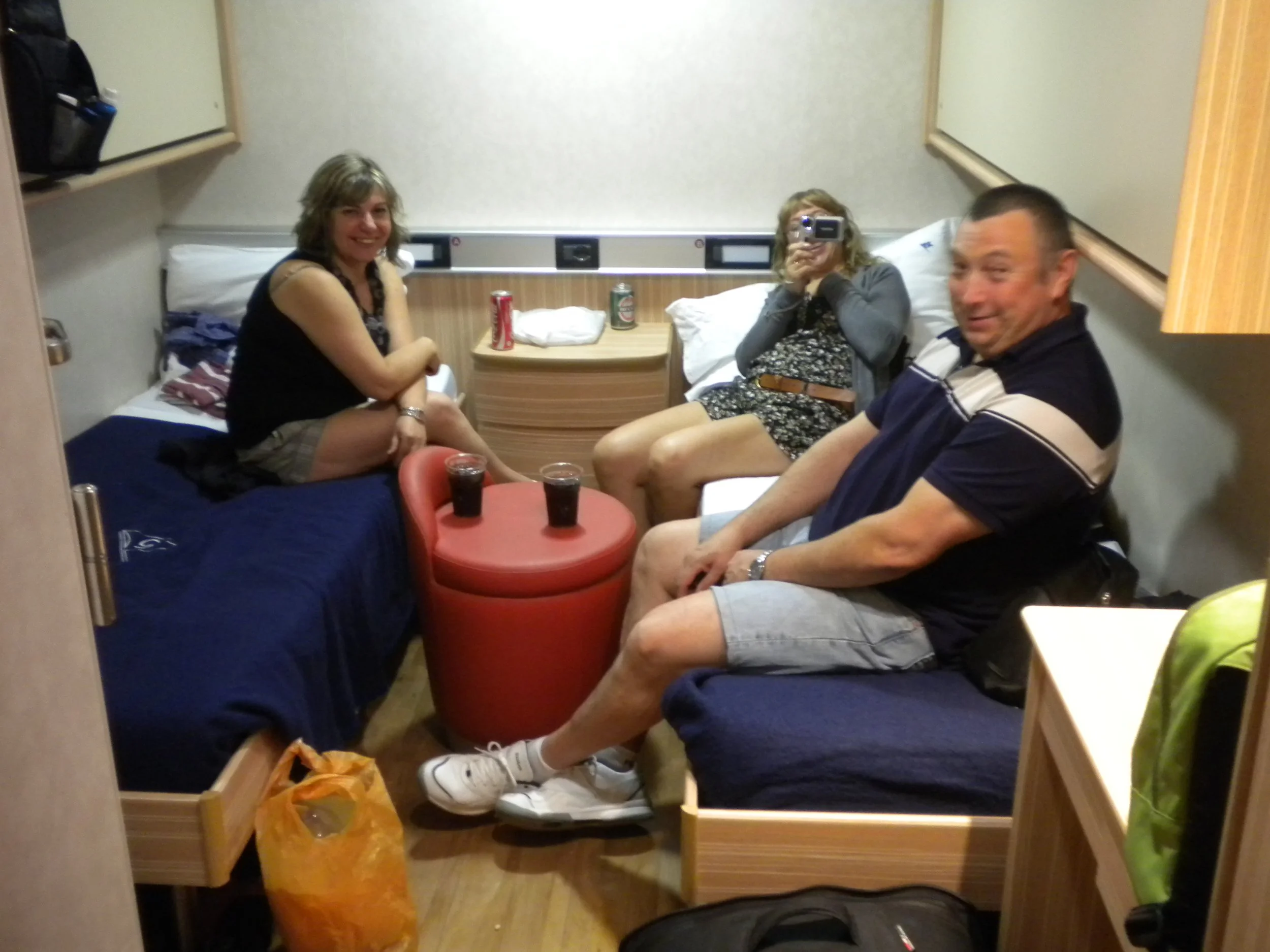Y subimos al camarote ( 4 literas, baño con ducha), el barco está genial, es muy moderno, parece un minicrucero, tiene sala de conferencias, casino, cafetería, restaurante, sala infantil, tiendas, piscinas, etc., muy buena travesía, pero con tormenta y fresco, pero ni con esas el barco se mueve.