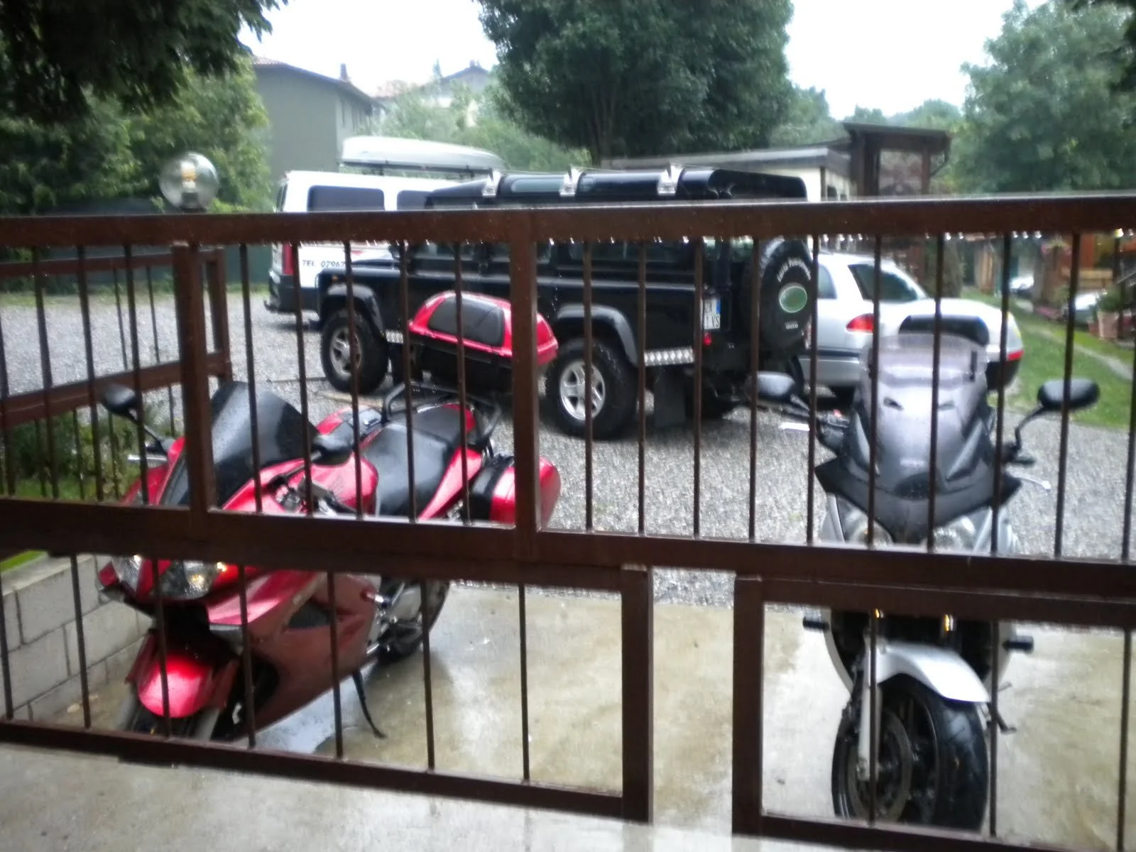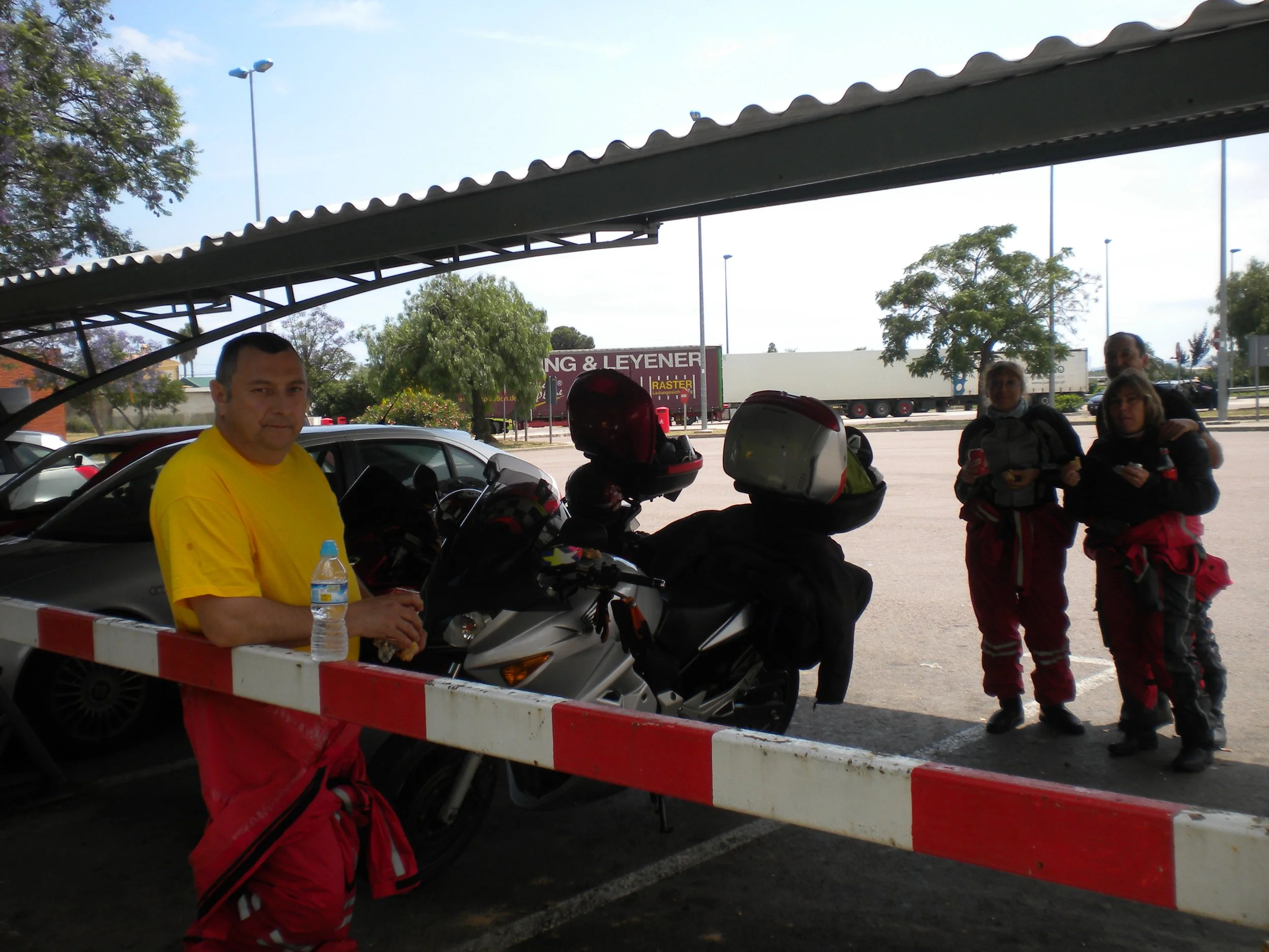Tormenta entre el km 400 y 436, menos mal que llevábamos los trajes de agua". Este viaje ha sido un poco lento pues Fermín le entraba el sueño y tenemos que hacer varias paradas para refrigerio y espabile de él. A Tere se le rompe una de las botas y no hay en ninguna de las gasolineras pegamento. Nos encontramos con moteros franceses vienen de Gibraltar a Perpiñán.