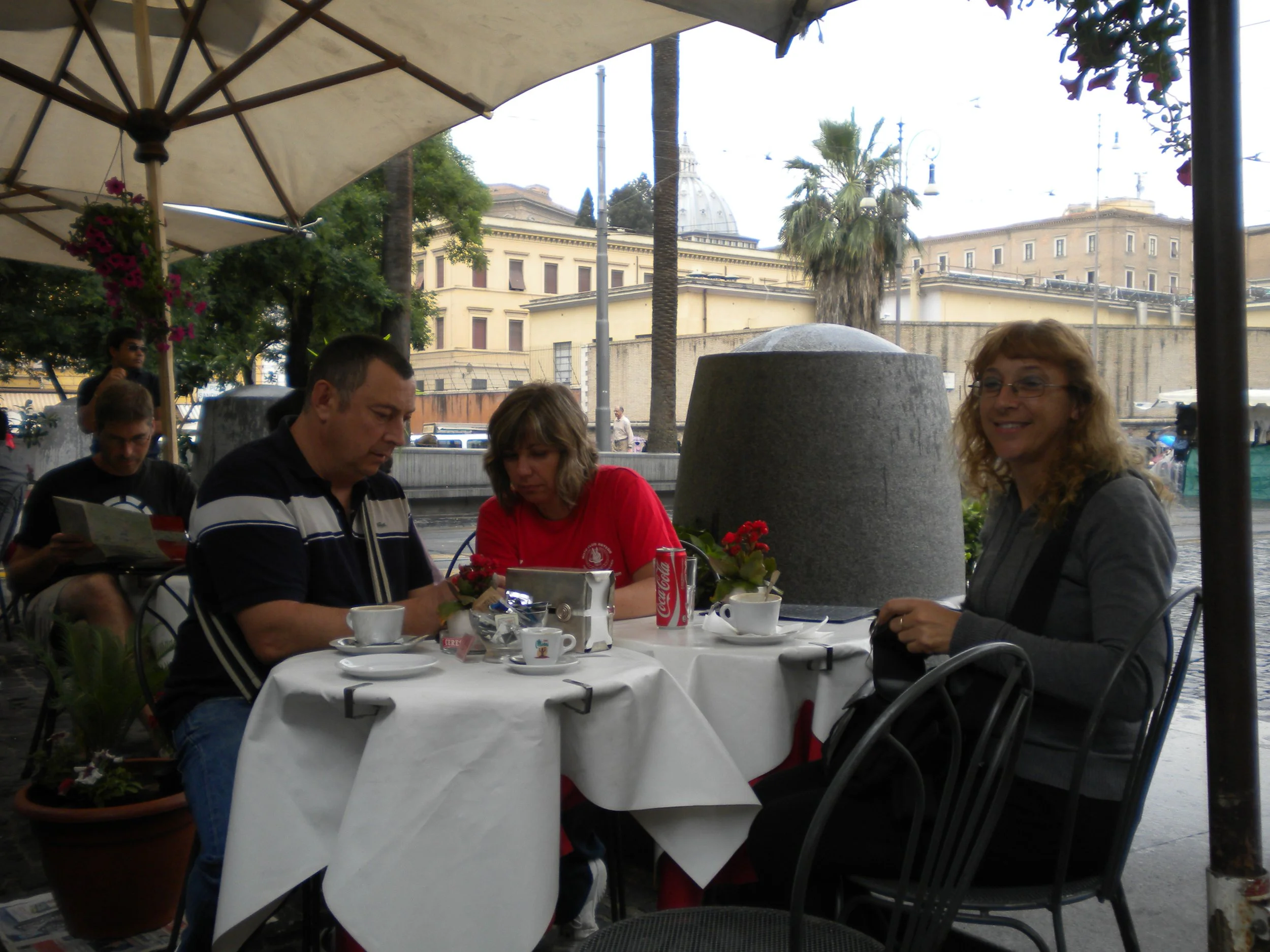 Pero cuando llevamos 10 minutos Jose se da cuenta que el billete no es válido, pues pensaba que duraba 24 horas, pero no es así dura hasta las 24:00 del día que se compra; entonces se pone pesado y nos hace bajar porque no vaya a ser que vengan los inspectores y nos hagan pagar la multa. Compramos unos nuevos y esperamos por el siguiente, tarda al menos 20 minutos en llegar y mientras esperamos echamos unas postales. Llegamos a la entrada del vaticano a las 10:45 aprox., menos mal que íbamos a ir mas temprano que ayer, jejeje, comienza a llover un poco y Jose dice de tomar un café, nos sentamos y primera clavada nos soplan por 3 cafés y una Coca-Cola 14 euros.