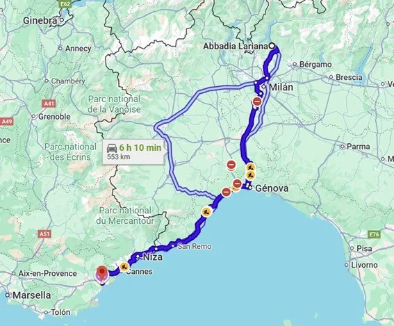 Salimos hacia la Costa Azul , es día 18 de Junio, ha amanecido nublado pero a medida que vamos tomando distancia del Lago De Como va mejorando, llegada al hotel "Etap Frejús" http://www.etaphotel.com