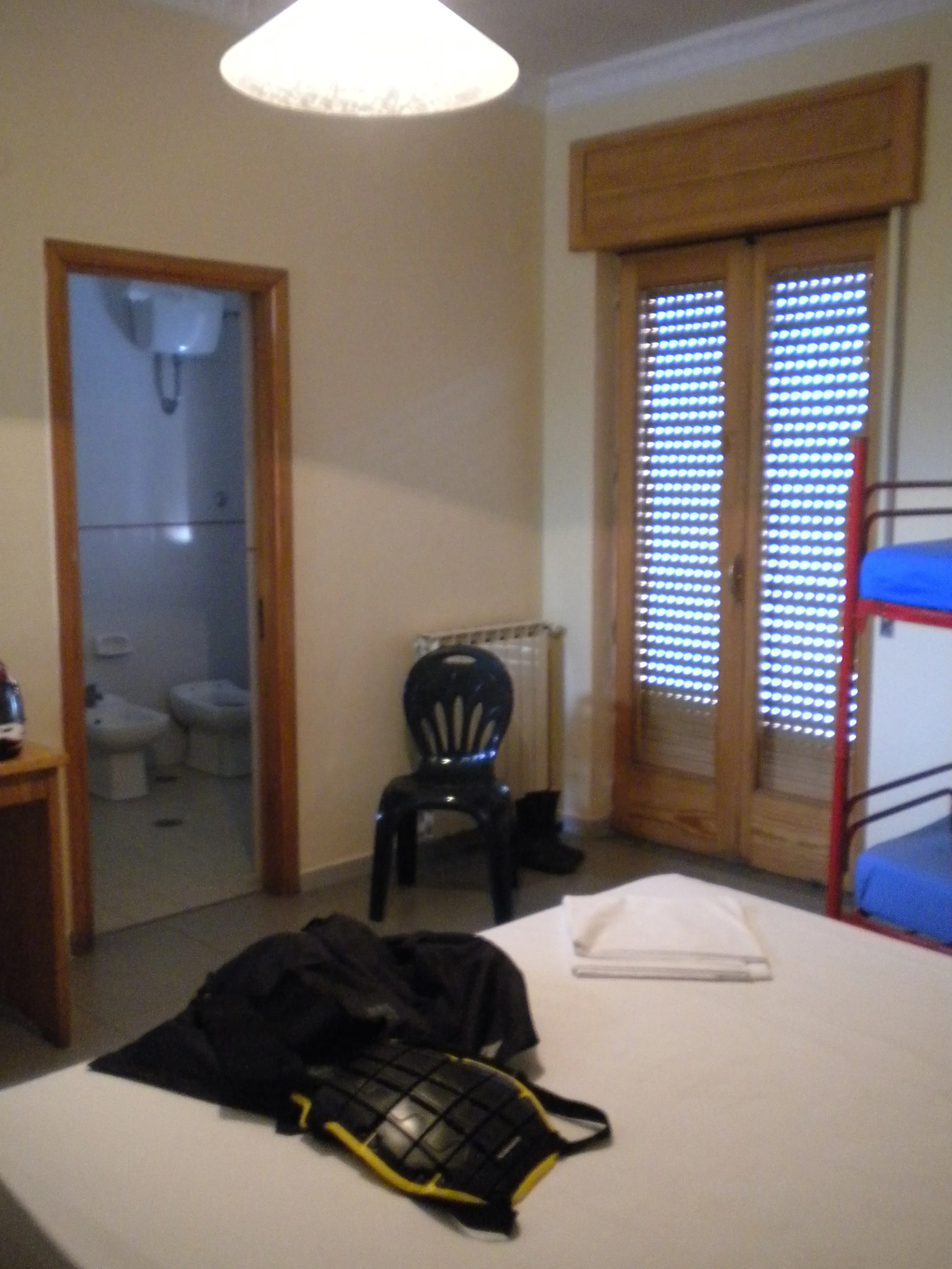 Conocimos a un matrimonio de Marbella, que también viajaban a Roma y en moto, intercambiamos e-mail, y salimos al exterior, comienza a llover y nos colocamos los trajes de agua, caravana kilométrica hasta Roma (aprox. 80 Km), colándonos entre los coches y por el arcén con precaución de no tropezarnos con los caravinieris. Llegamos a Roma (Tor di Quinto) a la Residencia a las 21:40, lloviendo, y nos encontramos que estaba todo apagado y sin nadie a la vista, después de 20 minutos llamando a todas las puertas y pensando en dormir debajo de un puente, conseguimos localizar un teléfono y contactar con el oficial de guardia, nos acomodamos, en las habitaciones un poco antiguas pero bastante bien y con baño con ducha dentro.
