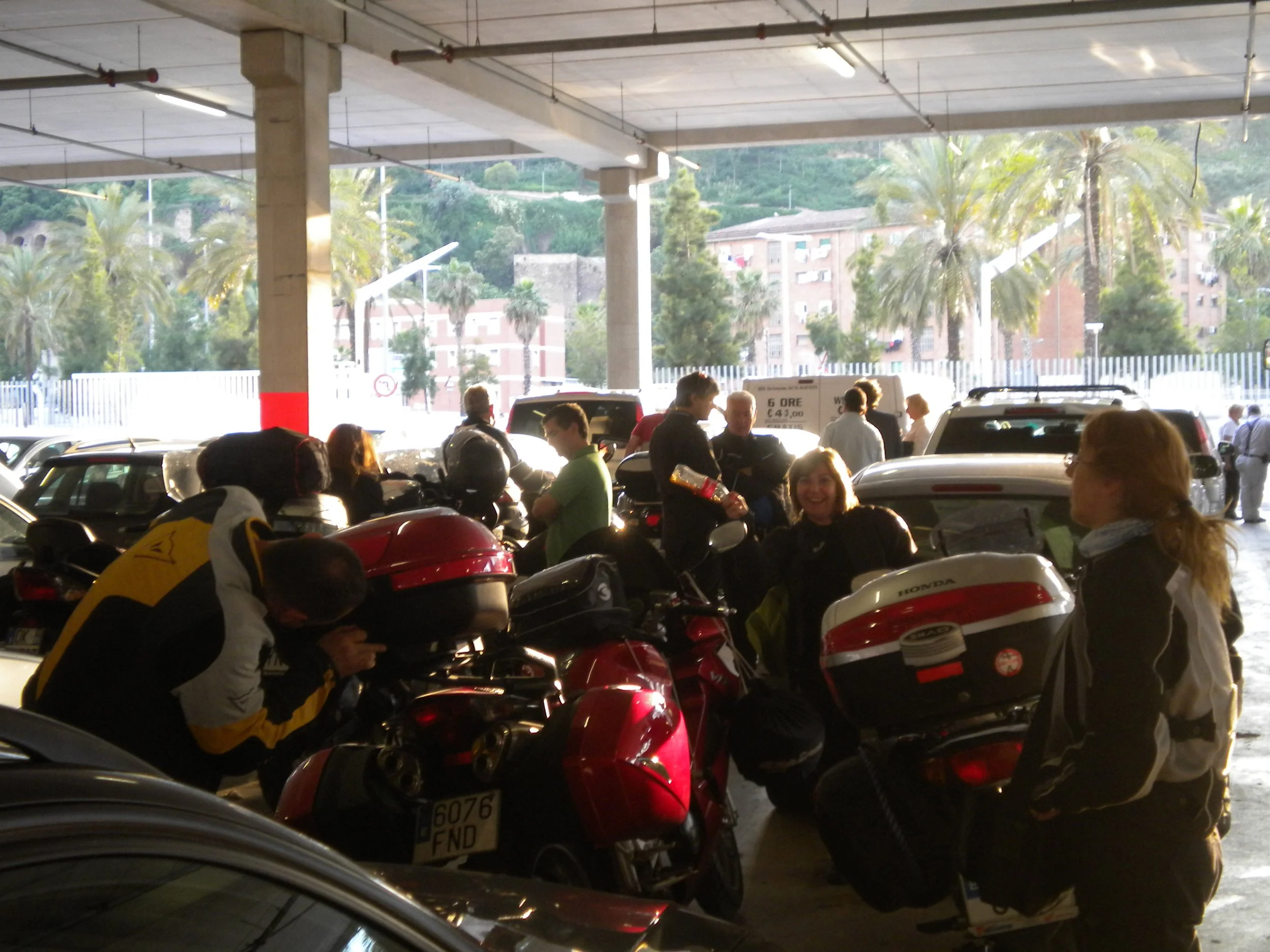 Y por fin después de los consiguientes enfados de Tere por el sueño de Fermín conseguimos llegar a Barcelona. Son las 18:00, dejamos estacionadas las motos en la Comandancia y nos vamos a comprar para la cena y el desayuno del día siguiente. 19:30 salimos al puerto para realizar el embarque