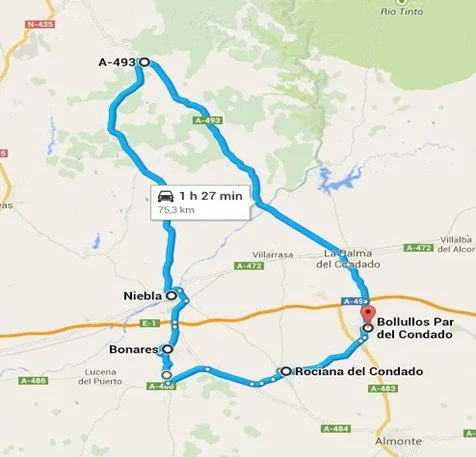 Los pueblos visitados han sido La Palma del Condado, Niebla y Bonares, con un recorrido entre los 60 y 80 Km. Además de los ya recorridos hasta llegar allí.